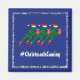 Three christmassy runners carrying parcels and dressed in festive hats and boots. The background is dark blue, with a whispy frame in white. The accompanying hashtag caption in white text can be edited according to preference. #ChristmasIsComing