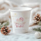 The "Santa Baby" shower paper cup has a sweet, festive design, featuring a baby in a pink Santa hat with soft clouds and stars. It uses playful red script and pastel tones, creating a cosy holiday feel, perfect for a winter baby shower.