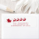 Fun return address label for the Christmas holiday season featuring a red silhouette of reindeers flying Santa's sleigh through air, and your family name and address in simple modern red typography.