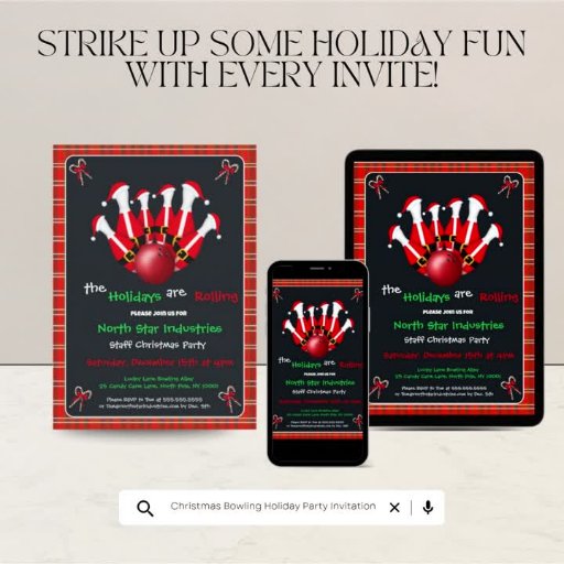Santa is ready for this bowling party with this fun invitation. This original design features Santa with a red marble design bowling ball with snowflakes and bowling pins. Great invitation for friends, businesses and families.