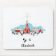 A mouse pad with a digital image of a painted illustration with a red church and steeple. A brigt star shinging overhead. Families out in front arriving for a church service. Winter snow covers the ground and rests on cute bushy pine trees.