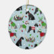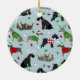 Cute Christmas Schnauzers with salt and pepper and black and silver coats wear Santa hats, antlers and argyle sweaters on a blue background with scattered ornaments.