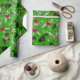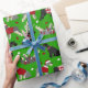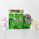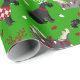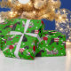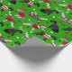Cute Christmas Schnauzers with salt and pepper and black and silver coats wear Santa hats, antlers and argyle sweaters on a green background with scattered ornaments.