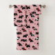 Cute Scottie dogs dressed in festive holiday outfits, Santa hats and argyle sweaters with scattered Christmas ornaments on a pink background.
