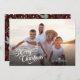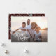 This simple full photo Christmas card features elegant modern script and space on the back for a personal message. The backside offers a boho winter greenery pattern appearing in soft tans and teals on a deep dark burgundy background.
