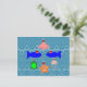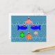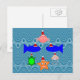 This postcard features a collection of sea creatures wearing santa hats. The marine animals include a pair of blue fish, a cheeky looking little pink crab, a yellow starfish, a sparkly jellyfish and a cute little green turtle.