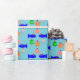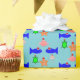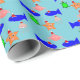 This awesome wrapping paper features a collection of sea creatures wearing santa hats. The marine animals include a pair of blue fish, a cheeky looking little pink crab, a yellow starfish, a sparkly jellyfish and a cute little green turtle.