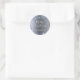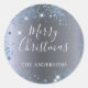 A faux silver metallic looking background, decorated with blue and faux silver glitter dust. Personalise and add your familie name. The text: Merry Christmas is written with a modern hand lettered style script, letters. Blue text.