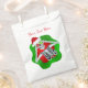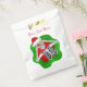 This party favour bag has a funny skeleton holding Christmas tree ornaments up to his eyes wearing a red Santa hat inside a bright red and green wavy circle. Customise your text with the template.