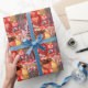 A Christmas Sled shot close up that's bright and colourful that's on wrapping paper.