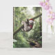 A sloth wearing a red and white Santa hat and a red scarf hangs comfortably from a branch in the middle of a lush, green forest