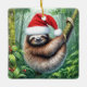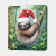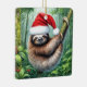 A sloth wearing a Santa hat hangs comfortably from a branch in the middle of a lush rainforest