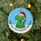 A cute green rattle rabbit snake wearing a red and white Santa hat sat in the snow with little white snowflakes falling from a blue sky. A template in curved black lettering to add your Christmas message.