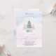 A winter Baby Gender Reveal party invitation. The Christmas holiday design features a snow globe with a newborn baby and Christmas trees on a watercolor splash blue and pink background.