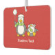 A little penguin cartoon with snowball and a fainted one. Both wearing green scarfs and santa hats.