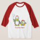 A little penguin cartoon with snowball and a fainted one. Both wearing green scarfs and santa hats.