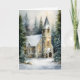 A peaceful stone church rests in a snow-covered forest, its warm windows glowing against the quiet of winter. This traditional Christmas card evokes faith, stillness, and gentle hope—perfect for sharing a heartfelt, timeless message of peace and grace.