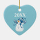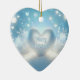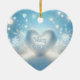 Glowing white heart in snow with floating bokeh lights and heart snowflakes.
