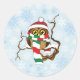 Cute chubby round owl all in red, white and green. Snowflakes falling all around him.