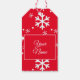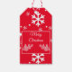 White snowflakes and Christmas trees on a red background. Please change the name on the backside of the tag to your own or delete the text box. If you like it a wrapping theme, you can find a gift bag with the same design in The Beau Corner store along with snowflakes ribbon and wrapping papers that goes perfectly well with this design. You can change the background colour to the colour if your choice.