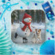 A cheerful snowman in a red knitted hat and scarf joyfully skates on a frozen pond, while a playful terrier dog joins the fun against a snowy forest backdrop