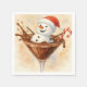 A cheerful snowman in a Santa hat enjoys splashing in a chocolate martini, complemented by a candy cane and cinnamon sticks, in this festive watercolor scene