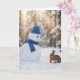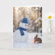 A snowman is scowling at a rabbit that is eating his carrot nose in the winter woods.