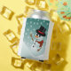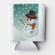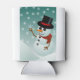 Cute snowman catching snowflakes. He has coal for his eyes and mouth and a carrot for his nose. A red and green stripped scarf around his neck and three buttons doen his front. Twigs for arms and a black top hat with a red band on top of his head. C.katt designs