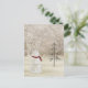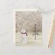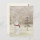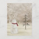 Cute snowman with gold star in winter woods with pine tree and bird.