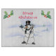 Christmas series Featuring a jolly snowman, holly leaves and red berries capped with snow, the snowman has his arm raised in greeting. A background of fir trees and snowdrifts completes the scene.