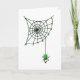 Cute and creepy green decorated spider hangs from his corner web holding an ornament. The spiderweb is covered in bright Christmas lights. Great twist on a traditional holiday image, by Briana Blair.