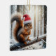 A squirrel wearing a Santa hat is perched on a snow-covered branch in a wintry forest, with sunlight filtering through the trees.