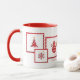 Christmas Modern Stamp Holidays Winter Personalised Name Tea Coffee Mug features the text "Merry Christmas" in red modern hand lettered calligraphy script typography accented with Christmas trees, snowflakes and snowman in red and white polka dots. Perfect for gifts for Christmas and Holiday parties. Designed by ©Evco Studio www.zazzle.com/store/evcostudio