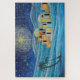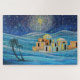 This Puzzle features a Christmas scene of a star over the city of Bethlehem with palm trees and dessert. The colours are blue, dark blue, orange and gold.