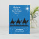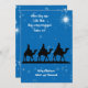Christian Christmas card with wise men and scripture about the star. Blue night sky with twinkling stars and one star that is large. The three wise men on camels are in black silhouette. White text at the top is, "When they saw the star, they were overjoyed" from the book of Matthew 2:10 NIV version. Add a signature at the bottom of the card.