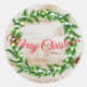 This round sticker is shown in a festive Christmas holiday wreath print.