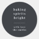 Add a stylish finishing touch to your festive packaging with these modern Christmas round stickers featuring the cheerful quote “baking spirits bright.” Designed in classic typography with a clean dividing line and your family name in elegant white, this minimalist label brings sophistication to any gift bag, cookie box, or holiday parcel. The bluish black charcoal gray background gives a contemporary Scandi-inspired look that pairs beautifully with neutral or metallic wrapping. Easily customize the name and message for a personal touch that makes your baked gifts and packaging stand out. A trendy and elegant design that perfectly complements homemade treats, festive hampers, and holiday business branding.
