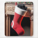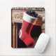 A large red Christmas stocking filled with coal hangs from an ornately carved fireplace mantel.