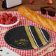 Part of a coordinating design set for Christmas, this paper plate features diagonal stripes in shades of gold, black and white. Optional 'Happy Holidays' text and a template has been provided to add your name and/or other text. Search ID861 thru ID864 to see additional colour options and other products in this modern, Christmas design set.