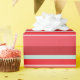 This wrapping paper has retro vibes, featuring a Christmas stripe pattern. The stripes are pink, crimson, blue, and rose.