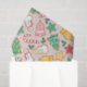 Adorable holiday wrapping paper with sugar cookie styled Christmas trees, snowmen, candy canes, and bells, on soft pink