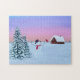 Acrylic painting of a cute snowman admiring a cardinal at sunset on Christmas eve