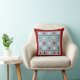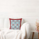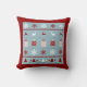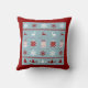 Cute Holiday Throw Pillow; Christmas Sweater pattern on a pale ice blue tile, on a crimson red pillow. Pattern contains white and red snowflakes, reindeer, wrapped presents, christmas trees, hugs and kisses (xoxo), and thin red doodle arrows. #Americana #FolkArt #RedWhiteandBlue