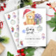 Watercolor cute teddy bear with christmas gift, in santa hat. On the reverse side of the card are holiday christmas pattern (candy cane, christmas tree ball toy, christmas socks).