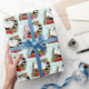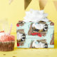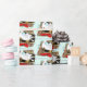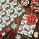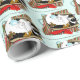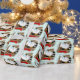 A chubby calico cat is in an opened Christmas box of toys and is happier with the box then the toys
