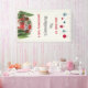 A Christmas party banner with a cute and whimsical Christmas theme. A cosy trailer decorated for Christmas set among some pine trees. Tree decorations along the top.