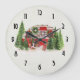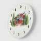 A clock with a cute and whimsical Christmas theme. A cosy trailer decorated for Christmas set among some pine trees.