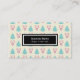 Business card with a cute christmas pattern with a cream coloured background with illustrations of a pastel greenish blue coloured christmas tree and a pastel pink bauble with a ribbon in a repeating pattern. The centre has a black rectangle with a white frame where you enter your business details. Nice contrast with the cream coloured pastel pattern.