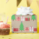 A wrapping paper designed with Christmas trees and gifts on a beige background. Merry Christmas!