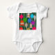 This baby bodysuit has a design that looks like ornaments in red, green, blue, pink, gold, silver, and white on a Christmas tree.